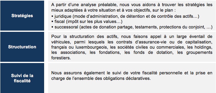 Toutes les stratégies que nous élaborons se fondent sur la situation personnelle de nos clients c’est-à-dire leurs besoins, leurs objectifs et leurs contraintes, dont nous suivons l’évolution en permanence. Nous demeurons particulièrement attentifs à ce qu’elles servent les intérêts de nos clients selon une vision long terme.